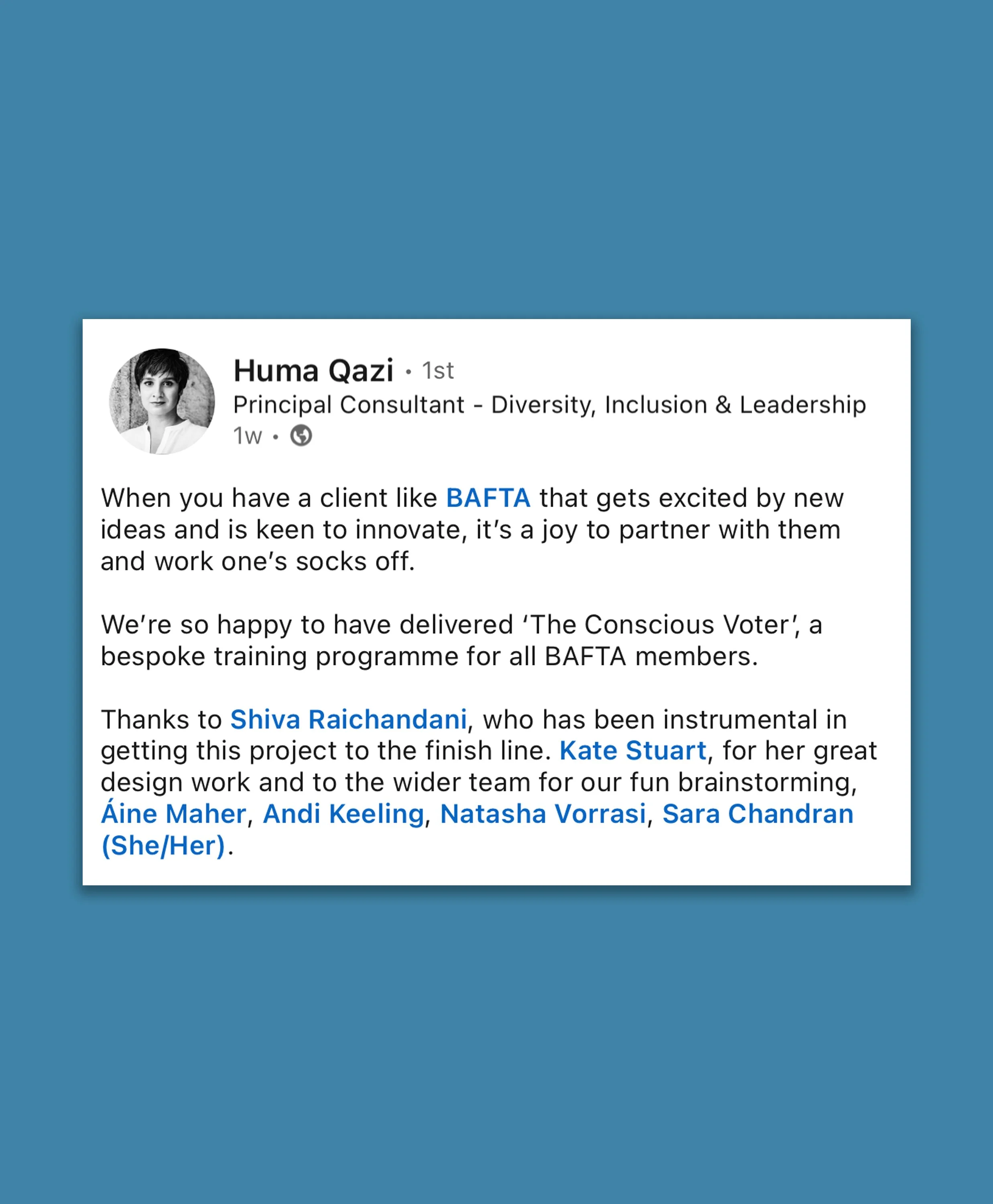 As part of their work at D&I consultancy New Inclusion, Shiva assisted Principal Consultant, Huma Qazi, in writing, developing, and video-editing content for BAFTA’s ‘The Conscious Voter’ - a bespoke training programme for all BAFTA voting members.